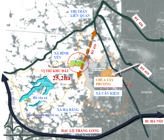 Khu đất cách Hà Nội khoảng 30km về phía Tây, có hướng kết nối hạ tầng thuận tiện thông qua tuyến đường đại Lộ Thăng Long, nằm trên trục phát triển về kinh tế của thành phố Hà Nội về phía Tây, nơi các dự án đầu tư khu dân cư và các thành phố mới phát triển mạnh mẽ. Khu đất có lợi thế về du lịch địa phương do gần các khu thắng cảnh nổi tiếng như: Chùa Tây Phương, Hồ Tân Xã…